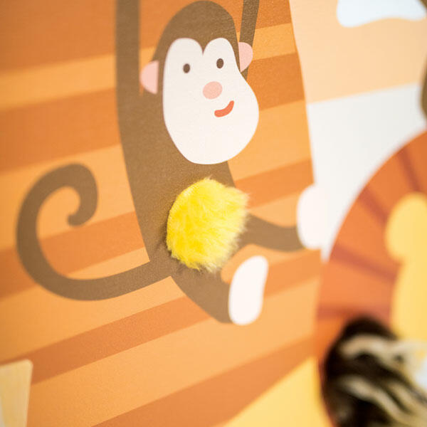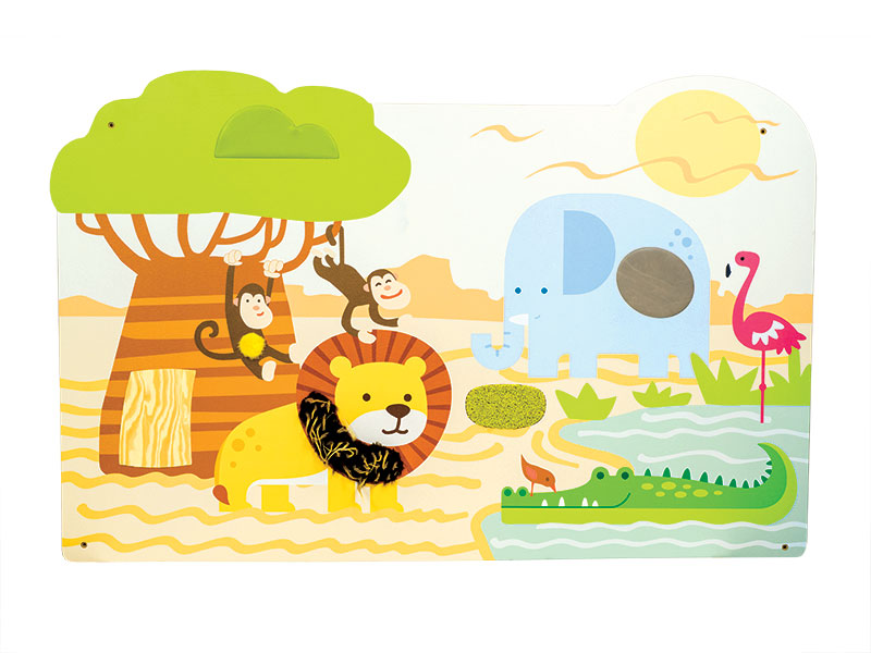 Quadro de manipulação sensorial "A selva" com elementos sensoriais: macaco com barriga macia, leão com juba, pele de elefante, casca de árvore, solo granulado...