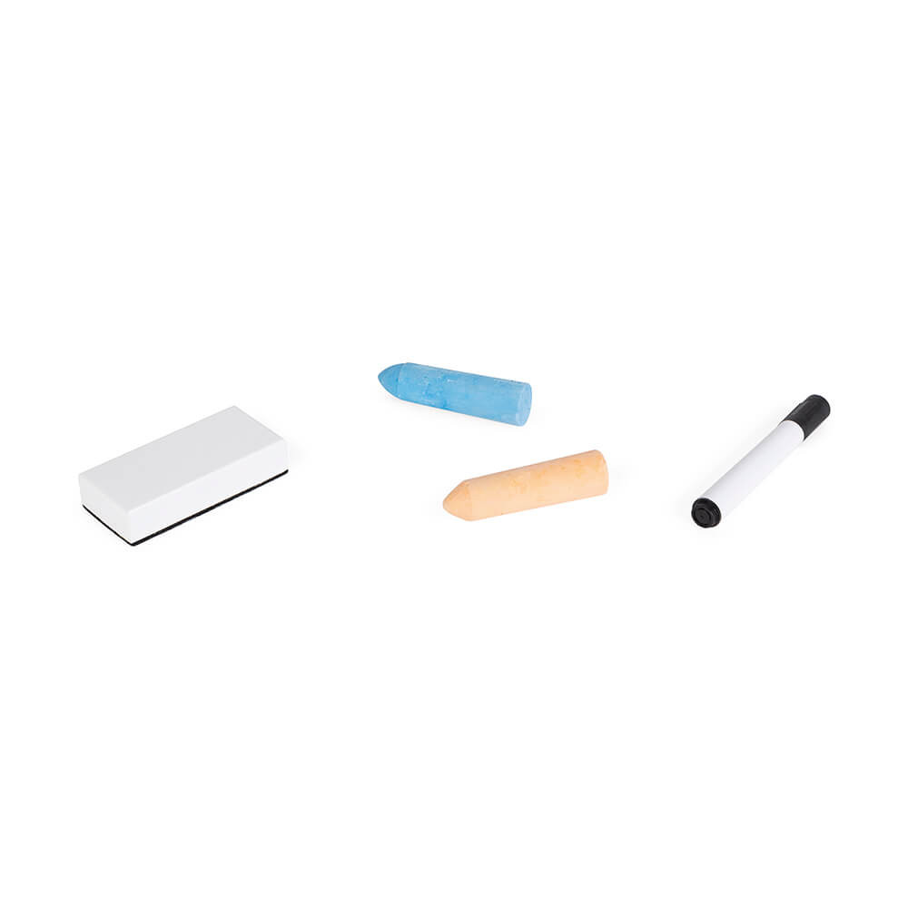 Um lado do conjunto possui um quadro negro para escrever a giz, enquanto o outro apresenta um quadro branco magnético para marcador apagável. Inclui 2 gizes grandes, 1 marcador apagável e um apagador.