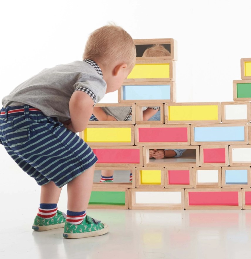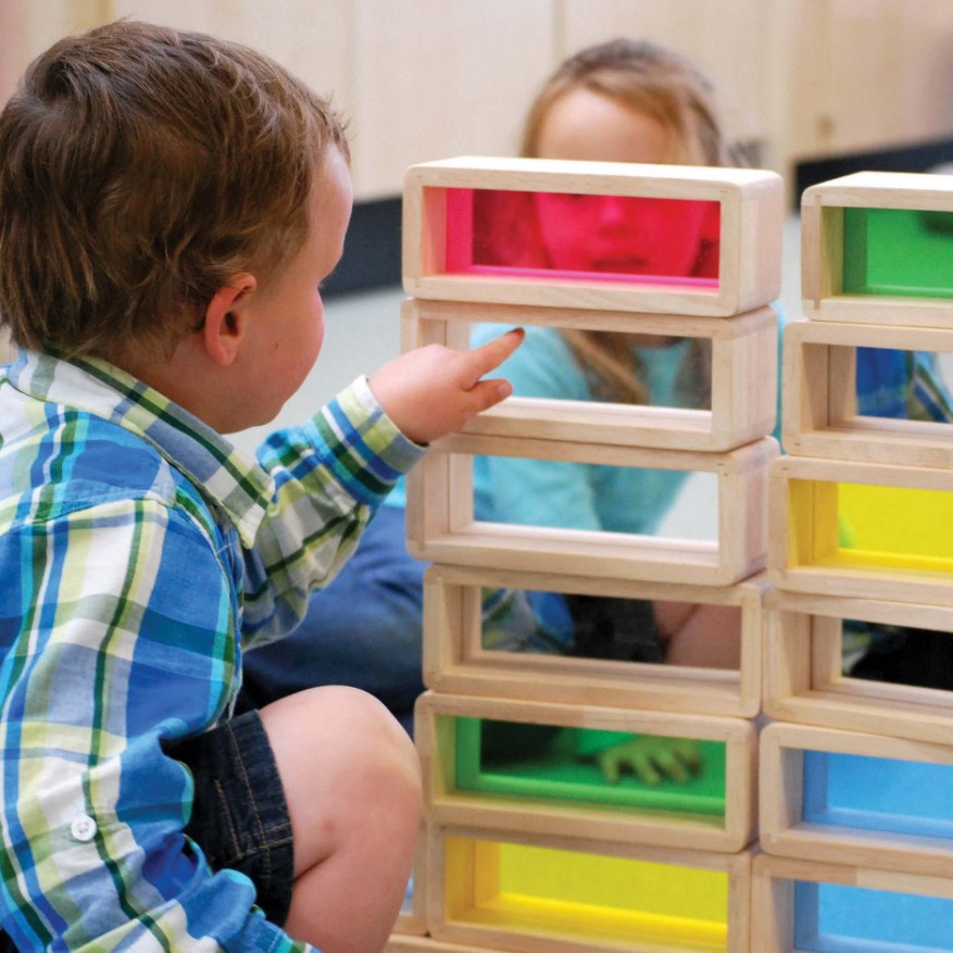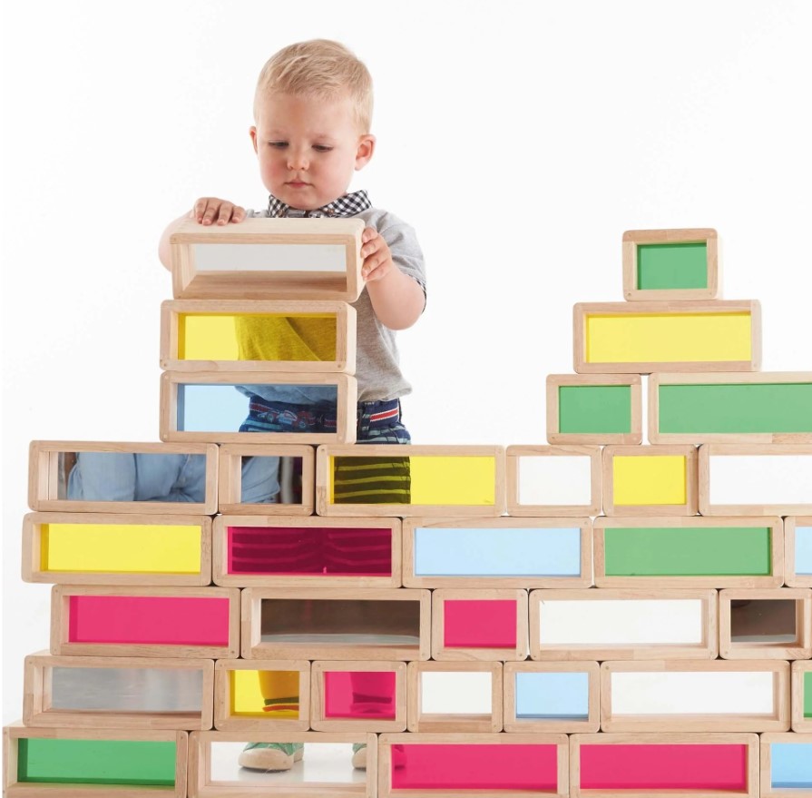 Os Rainbow Bricks da tickit são blocos gigantes de madeira de seringueira com centros de acrílico coloridos e translúcidos. A transparência do acrílico permite que a luz passe através, criando um efeito visual deslumbrante que cativa a imaginação da criança.