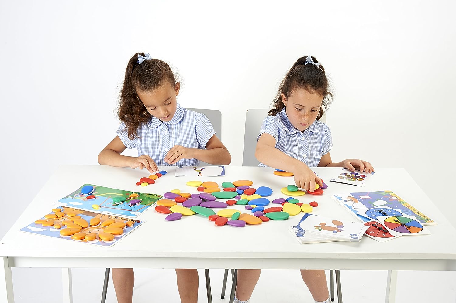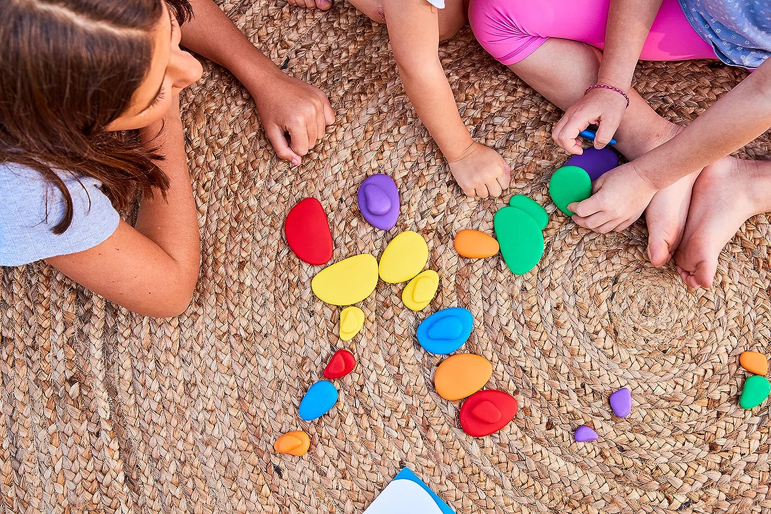 As pedrinhas podem ser usadas para aprender cores, fazer classificações, empilhar e sequenciar.
