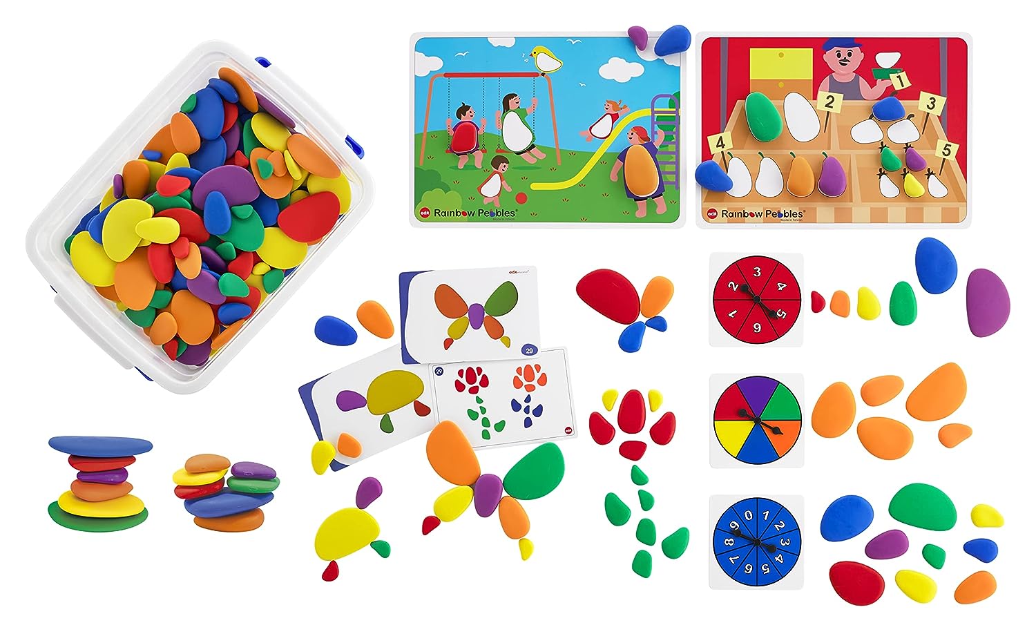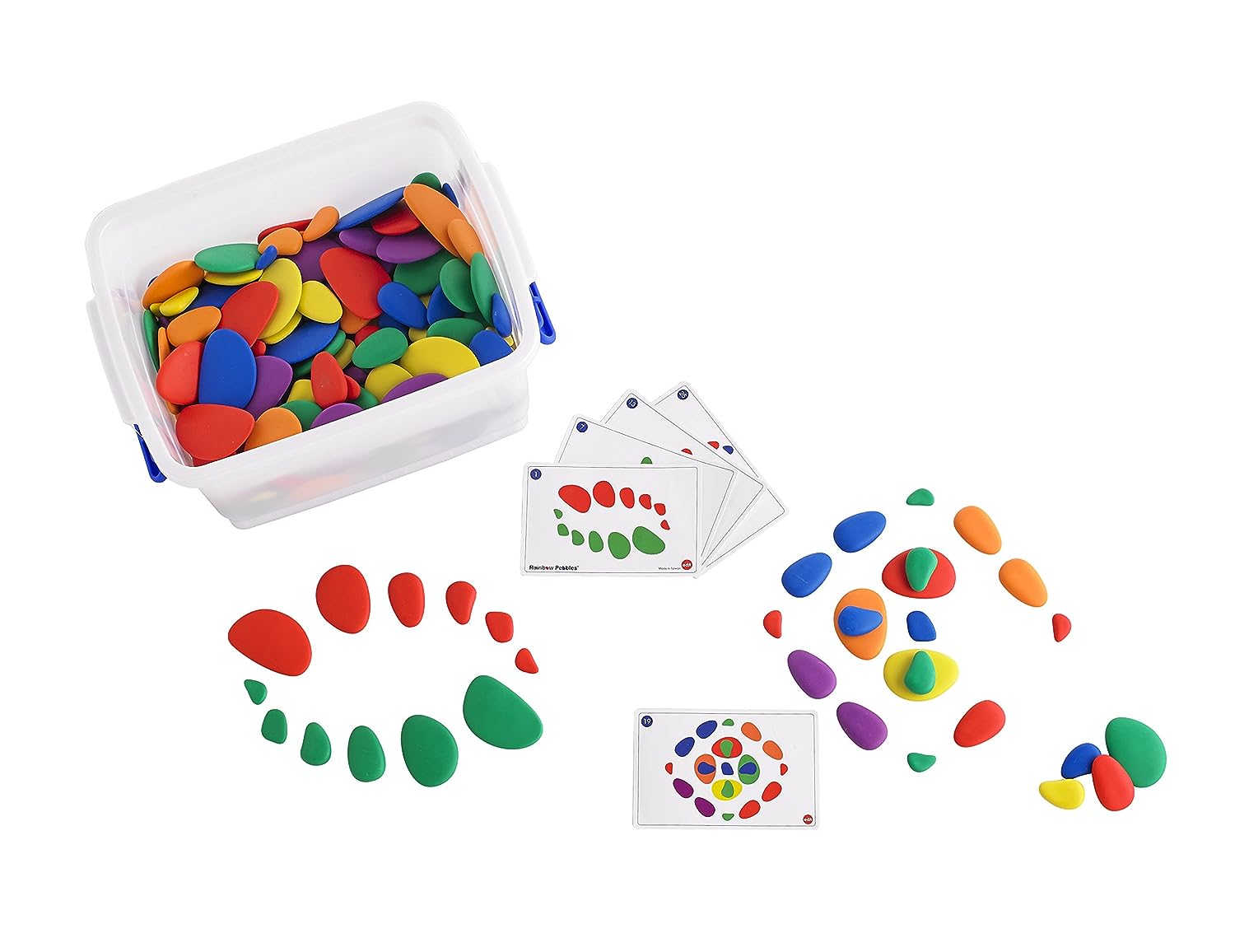 Conjunto inclui: 252 Rainbow Pebbles com 47 cartões de atividades dupla face