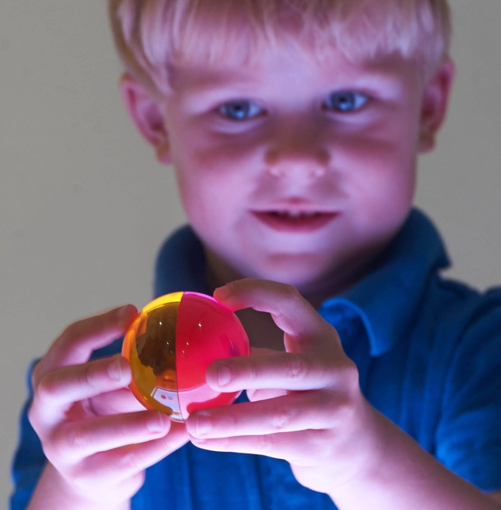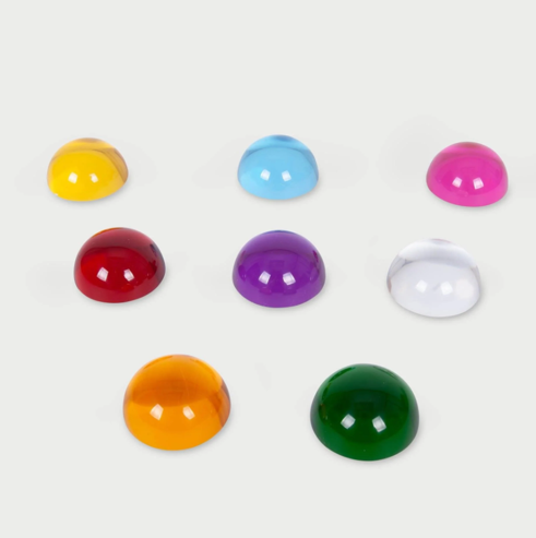 Para Crianças Mais Velhas: As semiesferas permitem que elas experimentem o mundo ao seu redor através de cores filtradas e visão ampliada. Colocar uma semiesfera sobre outros objetos aumenta a sua imagem em 4 ou 5 vezes, criando uma percepção colorida e ampliada.