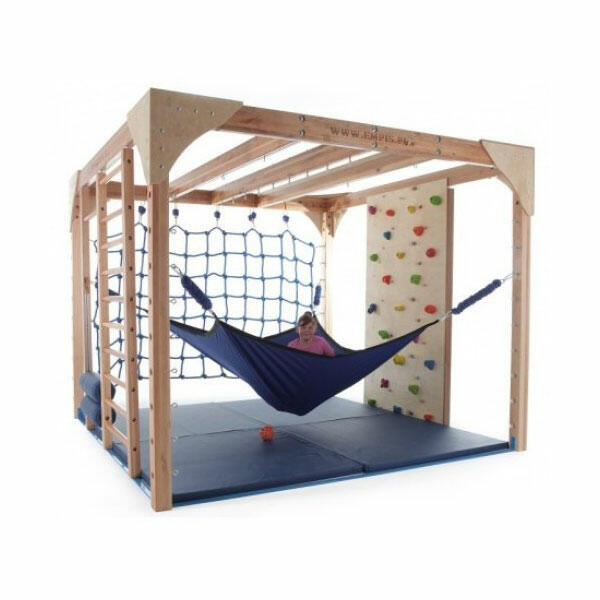 Esta grande estrutura de madeira é chamada de Sistema SENSIS. Muitos dos nossos produtos podem ser fixados nela e removidos novamente para facilitar o máximo de exercícios diferentes possível.