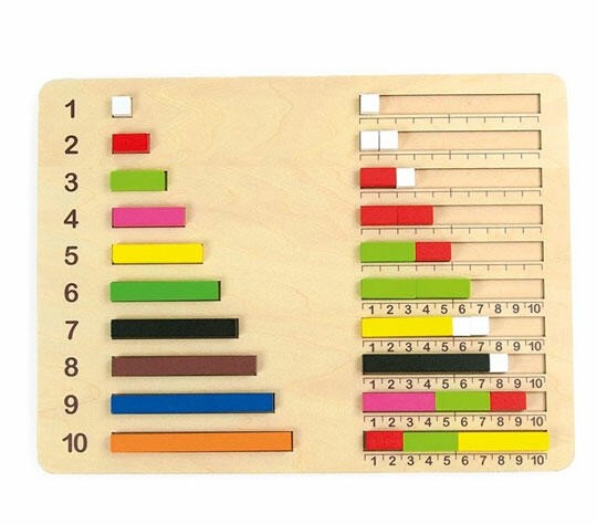 Dois quadros de madeira com gravuras, para posicionar e segurar as barras durante o jogo, permitindo praticar conceitos básicos de matemática e uma variedade de exercícios. Os quadros foram projetados para manter as peças no lugar durante a manipulação pelas crianças.