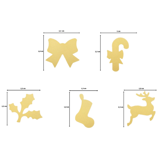 O conjunto é composto por: um laço de presente (1,8 x 2,5 cm), uma bengala de doce (1 x 2,5 cm), uma folha de azevinho (2,5 cm), uma meia de Natal (1 x 2,5 cm) e um renas (1,5 x 2,3 cm) para decorar infinitamente as suas criações em papel.