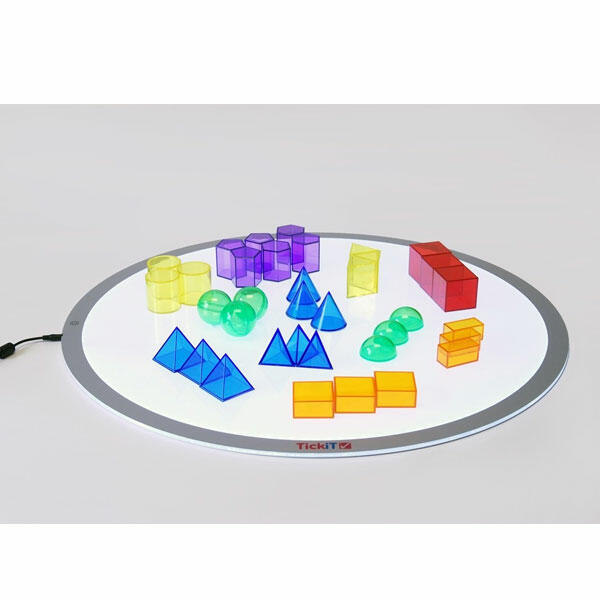 Conjunto de formas 3D de acrílico colorido, perfeito para utilização numa mesa de luz, para aprender os nomes e as características das diferentes formas e para explorar as cores e misturas de cores.