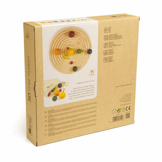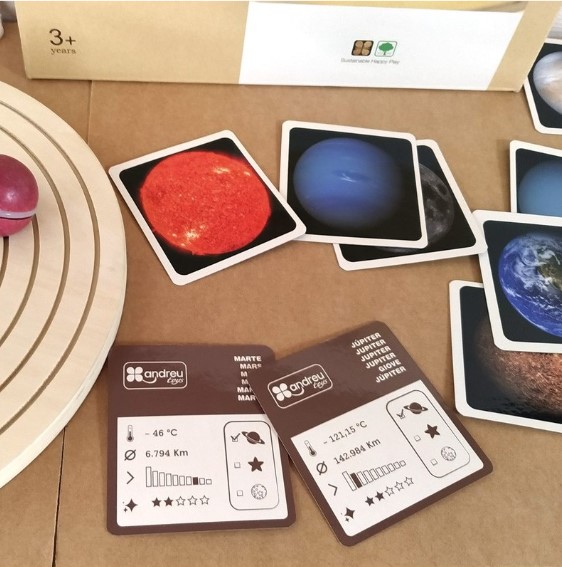 Inclui um guia educativo, um saco de pano para guardar os planetas e alguns cartões com fotografias reais dos planetas, que nos dão informações básicas como: temperatura, diâmetro, nível de luminosidade, tamanho e se é um planeta, estrela ou satélite natural.