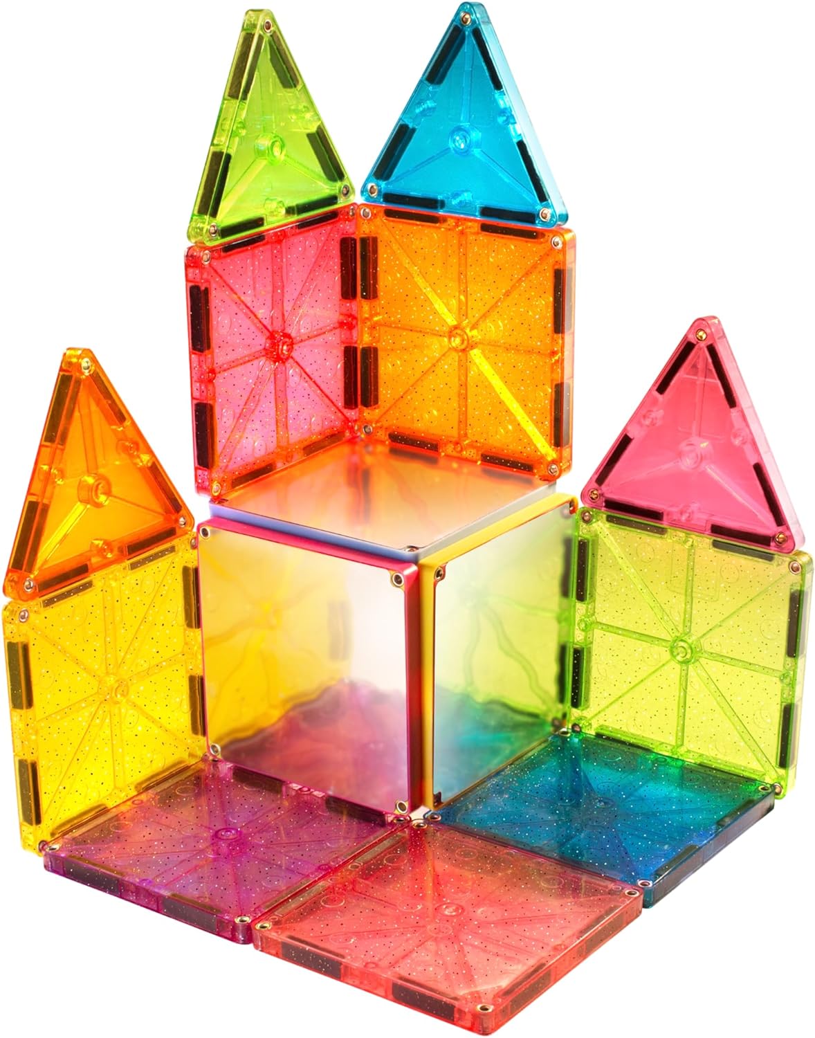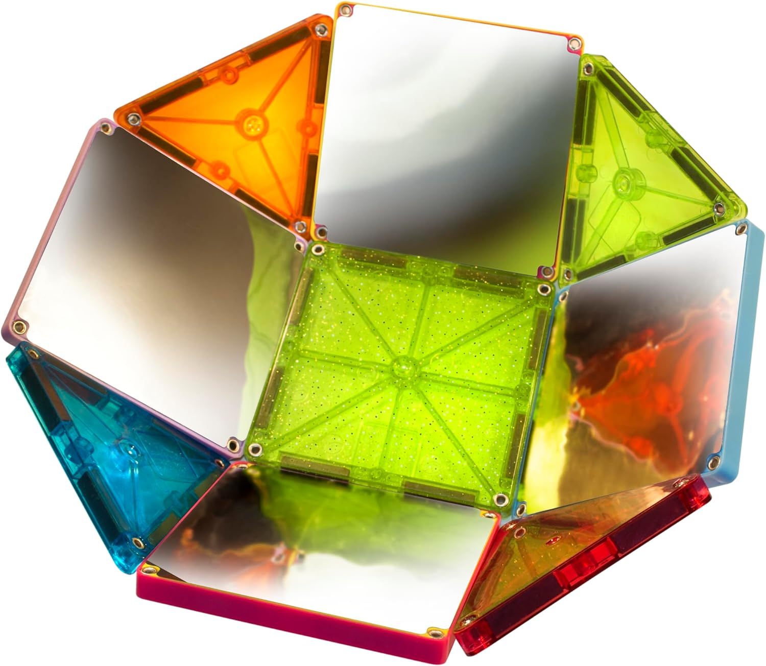 Uma nova versão do design original das MAGNA-TILES®, este deslumbrante conjunto de construção magnética apresenta telhas repletas de glitter suspenso e espelhos que captam a luz para um brilho extra.