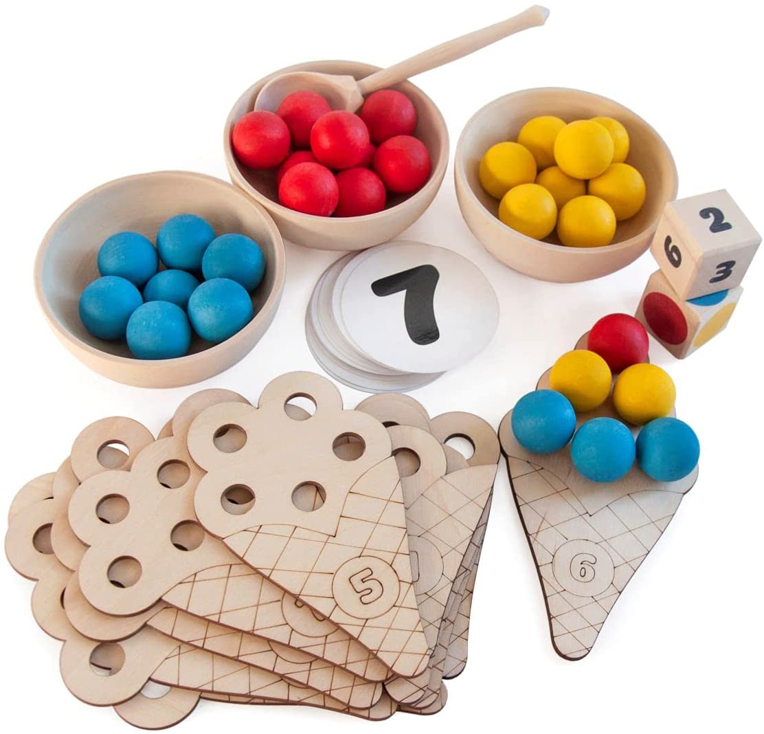 Este conjunto educativo Sweet Counting apresenta um total de 30 bolas de madeira, 3 tigelas de madeira, uma colher de madeira, 10 cones de gelado de madeira com números, 2 dados de madeira com cores e números, e cartões com cores, números, símbolos matemáticos e tarefas desafiantes. Além disso, inclui uma bolsa de linho para armazenar as bolas e uma bandeja de contraplacado para manter tudo organizado.
