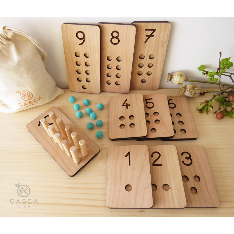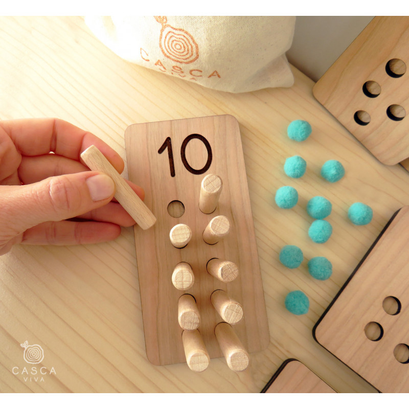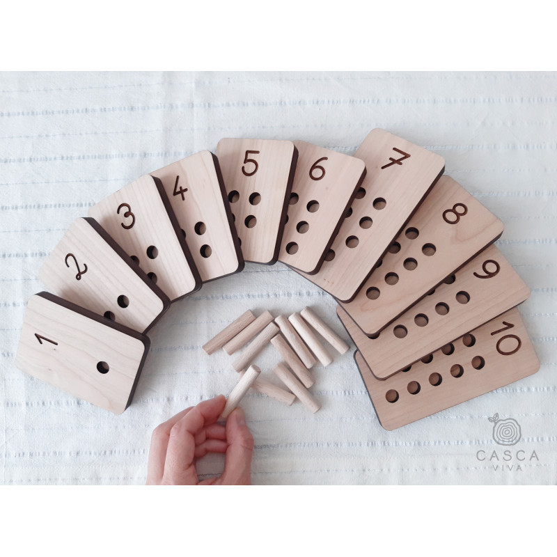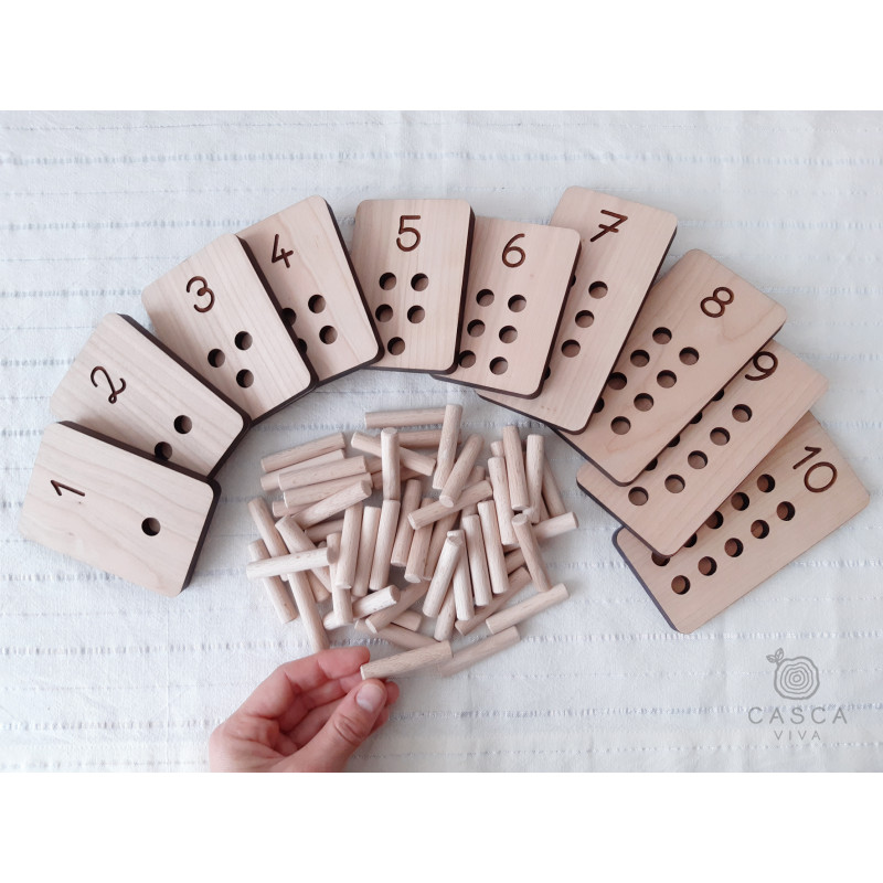 Cada tábua tem orifícios para colocar os pauzinhos, ajudando a trabalhar a coordenação e destreza manual.