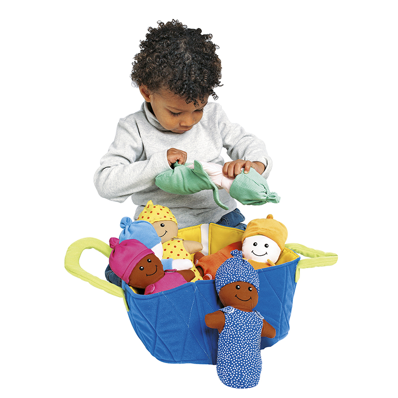 8 pequenos duendes em tecido com diferentes materiais para descobrir: algodão, cetim, veludo, lã, linho... A criança veste as bonecas combinando, através do toque e das cores, o saco de dormir e o gorro combinados.
