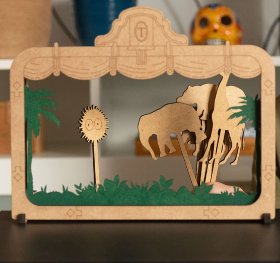 Nesta primeira fase, temos então a base de teatro, um cenário que é amovível, retratanto a selva, e figuras para acompanhar as histórias do Cuquedo e Grufalão.