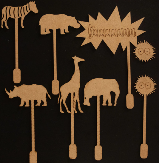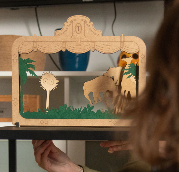 Neste material, temos uma base de madeira, a simular um teatro, onde podemos contar uma história e acompanhar com as figuras, também estas em madeira, ilustrando assim o que está a ser contado.
