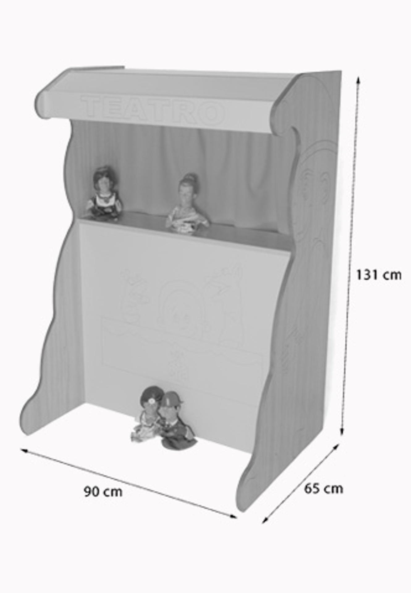 Móvel teatro para marionetas ou fantoches, com parte traseira aberta e prateleiras. Decorado na parte frontal com uma cena divertida que convida ao uso e com palhaços encantadores nas laterais. Possui uma barra com sistema antiqueda para pendurar as cortinas.