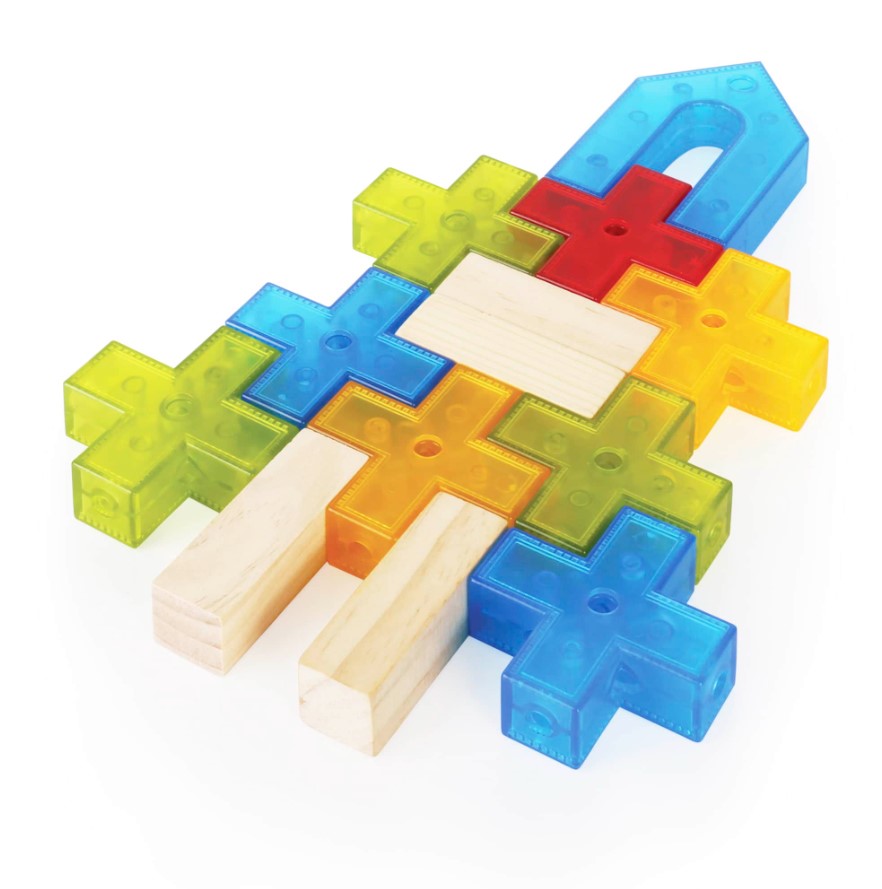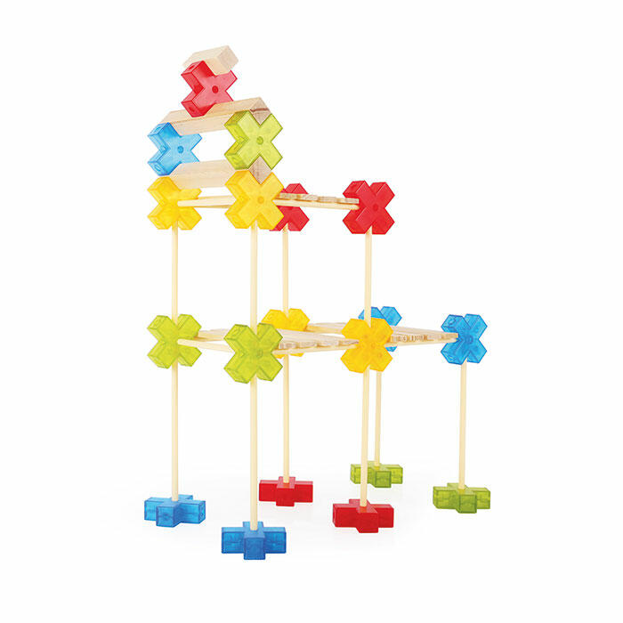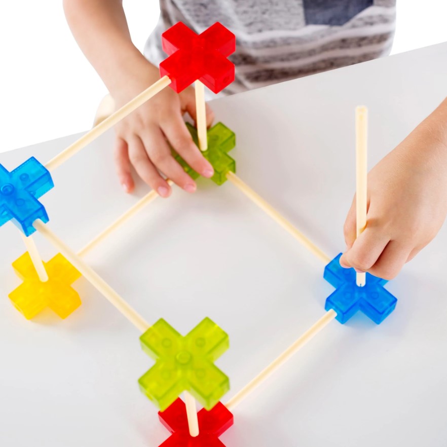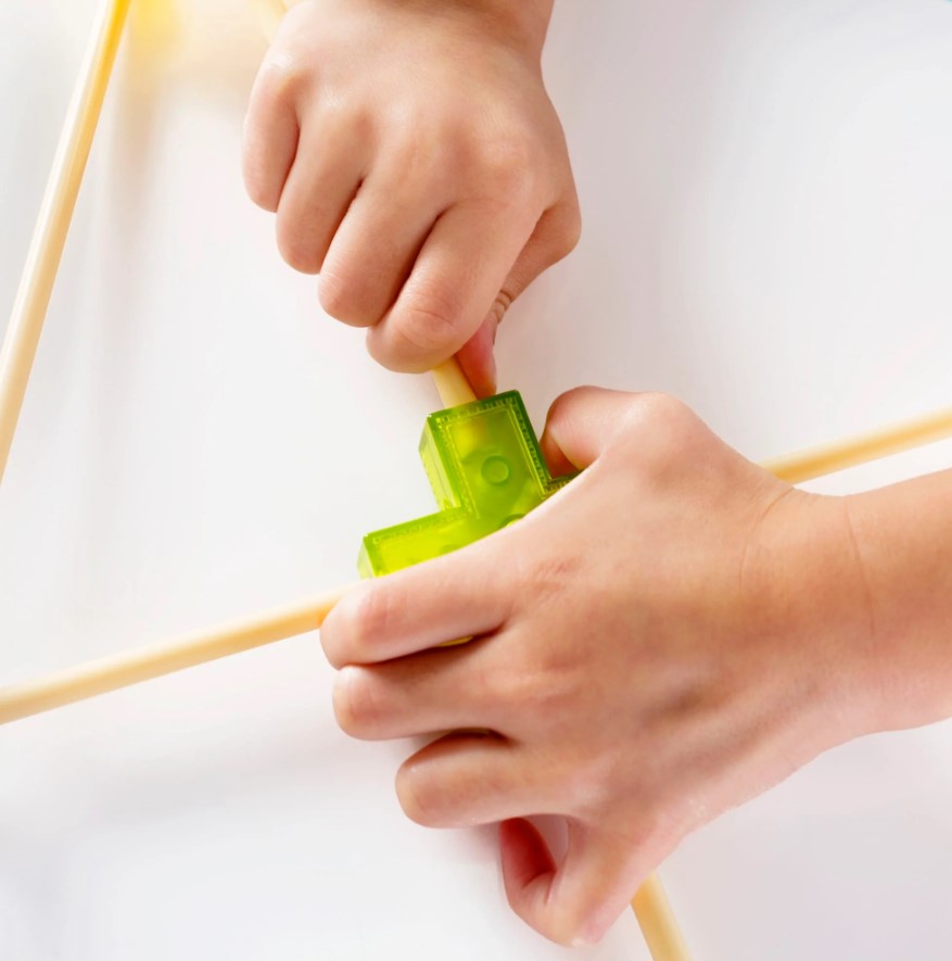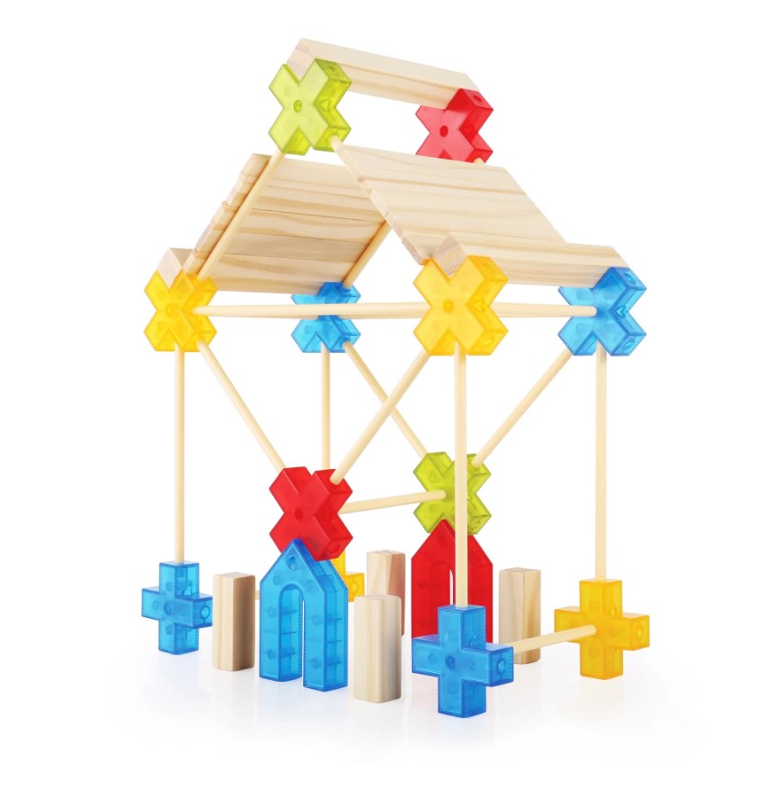 Hastes, pranchas e conectores geométricos encaixam-se de forma simples e intuitiva