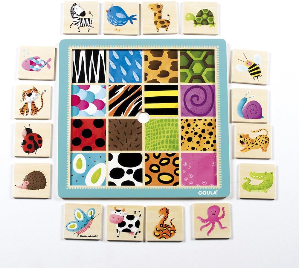 O Puzzle de Texturas Goula inclui 16 peças de quebra-cabeça de madeira com cores vivas, que podem ser retiradas para revelar a textura correspondente à imagem na peça. Isso permite que crianças pequenas distingam a diferença entre os animais e a sensação das texturas. O puzzle de texturas permite que as crianças experimentem as diferentes peças antes de encaixar corretamente a peça certa no lugar correspondente. Ajudar as crianças a descobrir coisas novas e empolgantes usando a sua imaginação é uma parte fundamental da promessa da Jumbo e Goula.