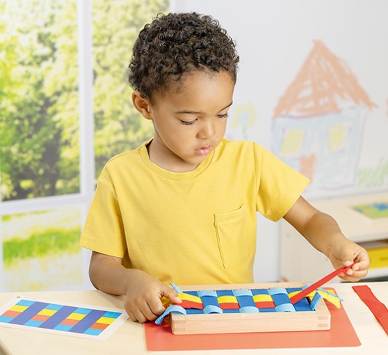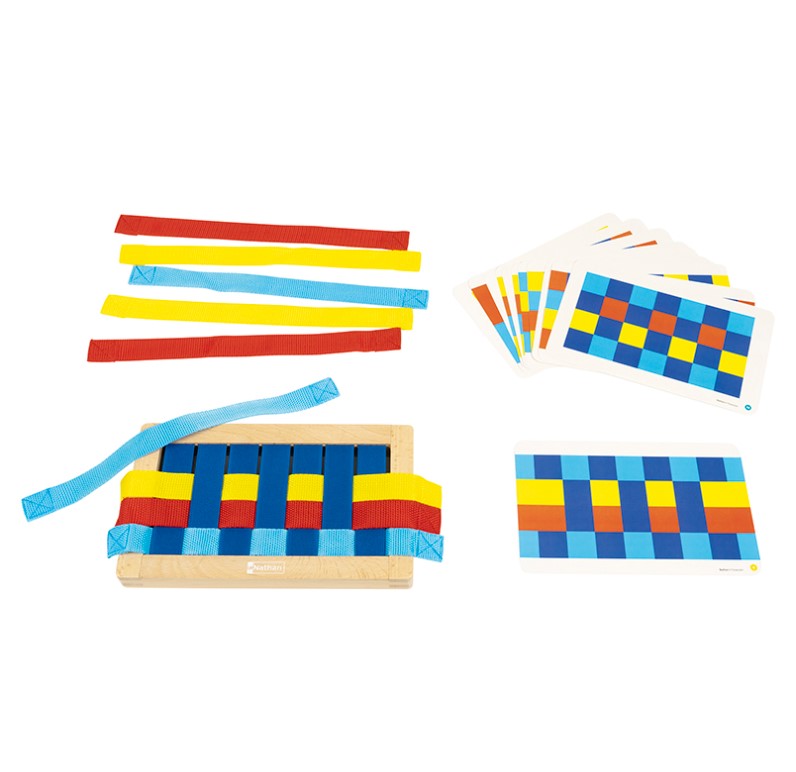 Objetivo do jogo: passar as tiras de tecido coloridas, uma a uma, entre os elásticos da moldura de madeira, primeiro livremente e depois para reproduzir os padrões das fichas.