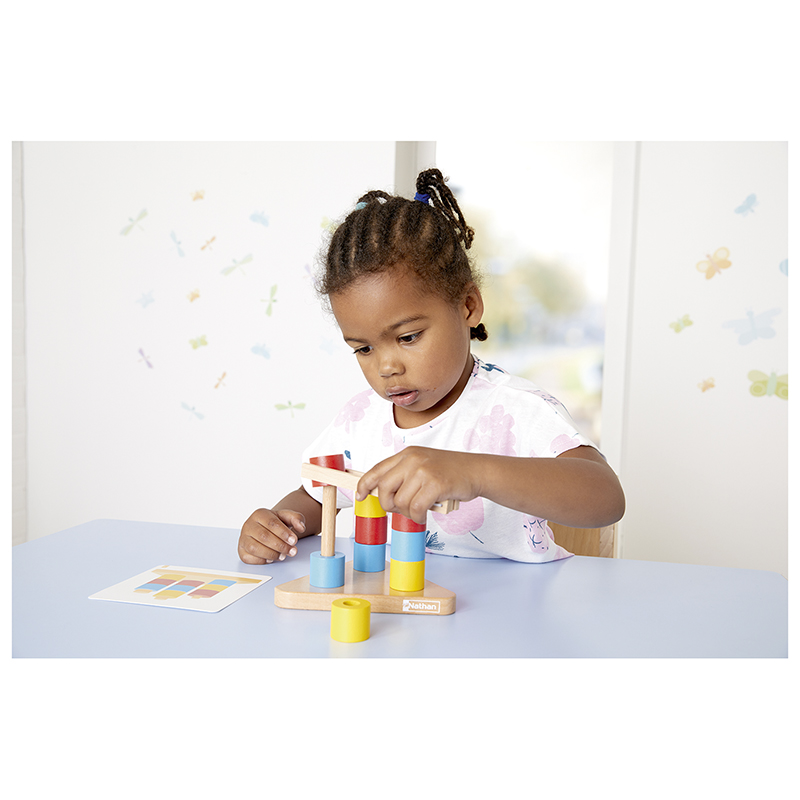 Neste conjunto educativo, as crianças são convidadas a participar em atividades lúdicas e de aprendizagem. São fornecidos 9 cilindros em 3 cores diferentes e 3 diâmetros internos distintos (pequeno, médio, grande), que as crianças vão enfiar nas hastes usando uma pinça de madeira. Inicialmente, têm a liberdade de explorar as formas e as cores, mas depois podem seguir as instruções dos cartões de atividades.